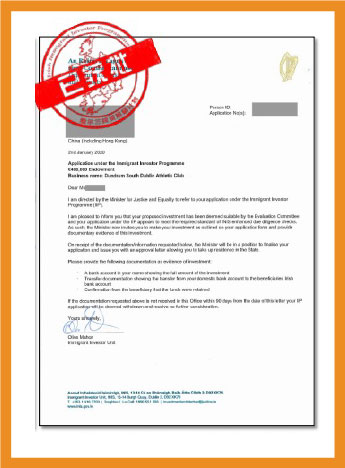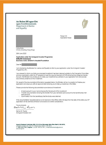 捐款不低于50万欧元至艺术、体育、健康、文化或教育领域的爱尔兰公益项目中,贡献于爱尔兰的公益慈善事业。